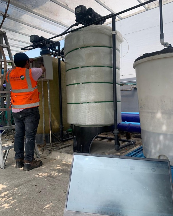 Nuestros sistemas de ablandamiento son utilizados para la remoción de sales de calcio y magnesio principalmente; causantes de la dureza del agua. Usan como medio filtrante a una resina catiónica que tiene una capacidad de remoción de 2 min por cada litro de resina. Esta resina realiza intercambio iónico, aportando sodio al agua, a cambio del calcio y magnesio que remueve. Para su regeneración requiere la inyección de salmuera (Sal + agua), la cual le devolverá el sodio necesario para continuar ablandando el agua.